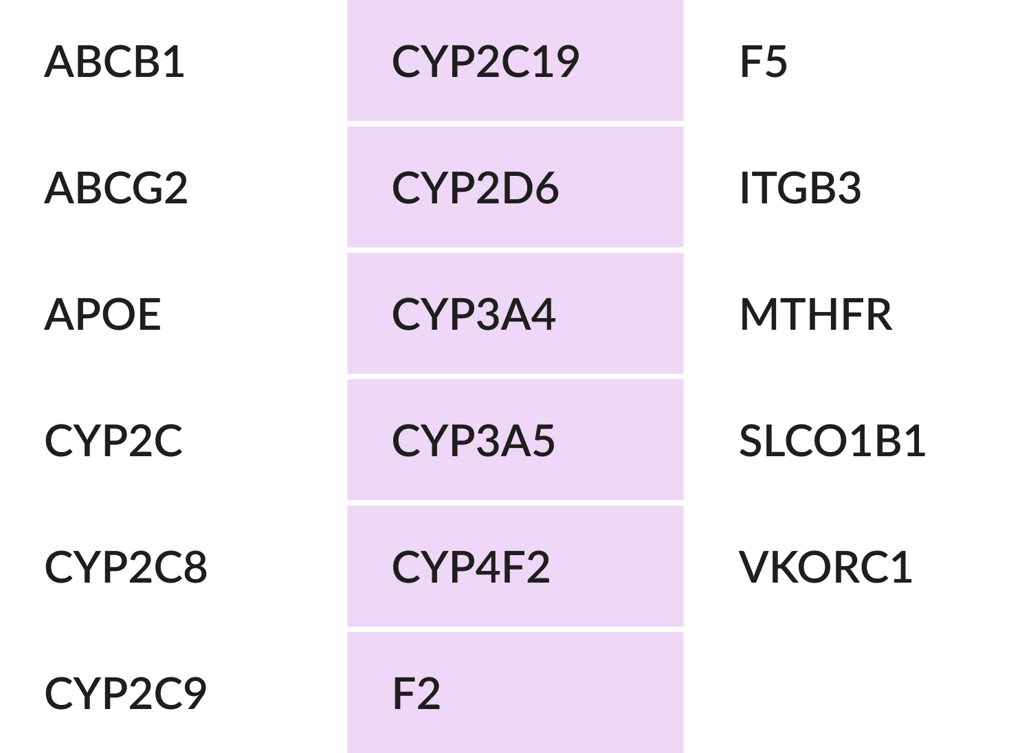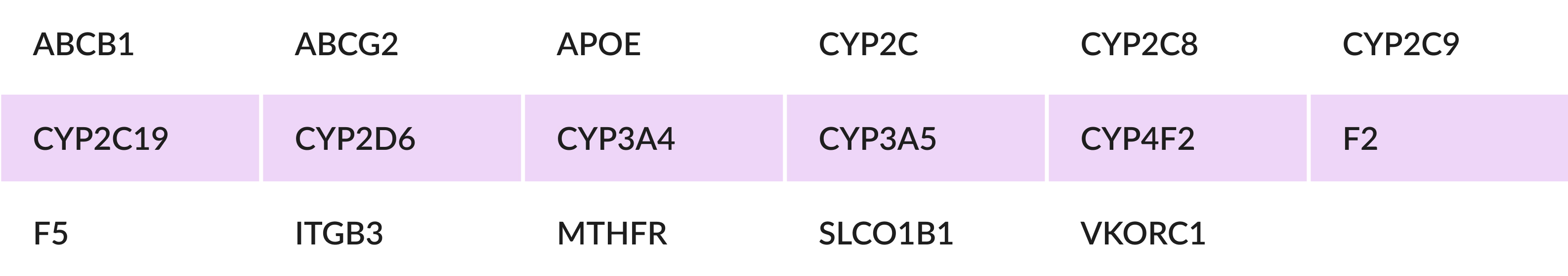 Depends on laboratories and patient population, Cardio Pharmacogenetics Gene Variation Panel might contain from several to a large number of targets including ABCB1, ABCG2, APOE, CYP2C, CYP2C8, CYP2C9, CYP2C19, CYP2D6, CYP3A4, CYP3A5, CYP4F2, F2, F5, ITGB3, MTHFR, SLCO1B1, VKORC1. PGx testing for cardiovascular medication provides genetic information that optimizes medication regimens for patients with heart disease. Healthcare providers can use PGx as a tool to better design a personalized treatment plan for their patients without having to take the trial-and-error approach, which can reduce the event of adverse drug reactions. Therefore, PGx enables safer, more effective, and cost-effective treatment by using genetic information that would help predict drug response, and further guide optimal drug and dose selection.